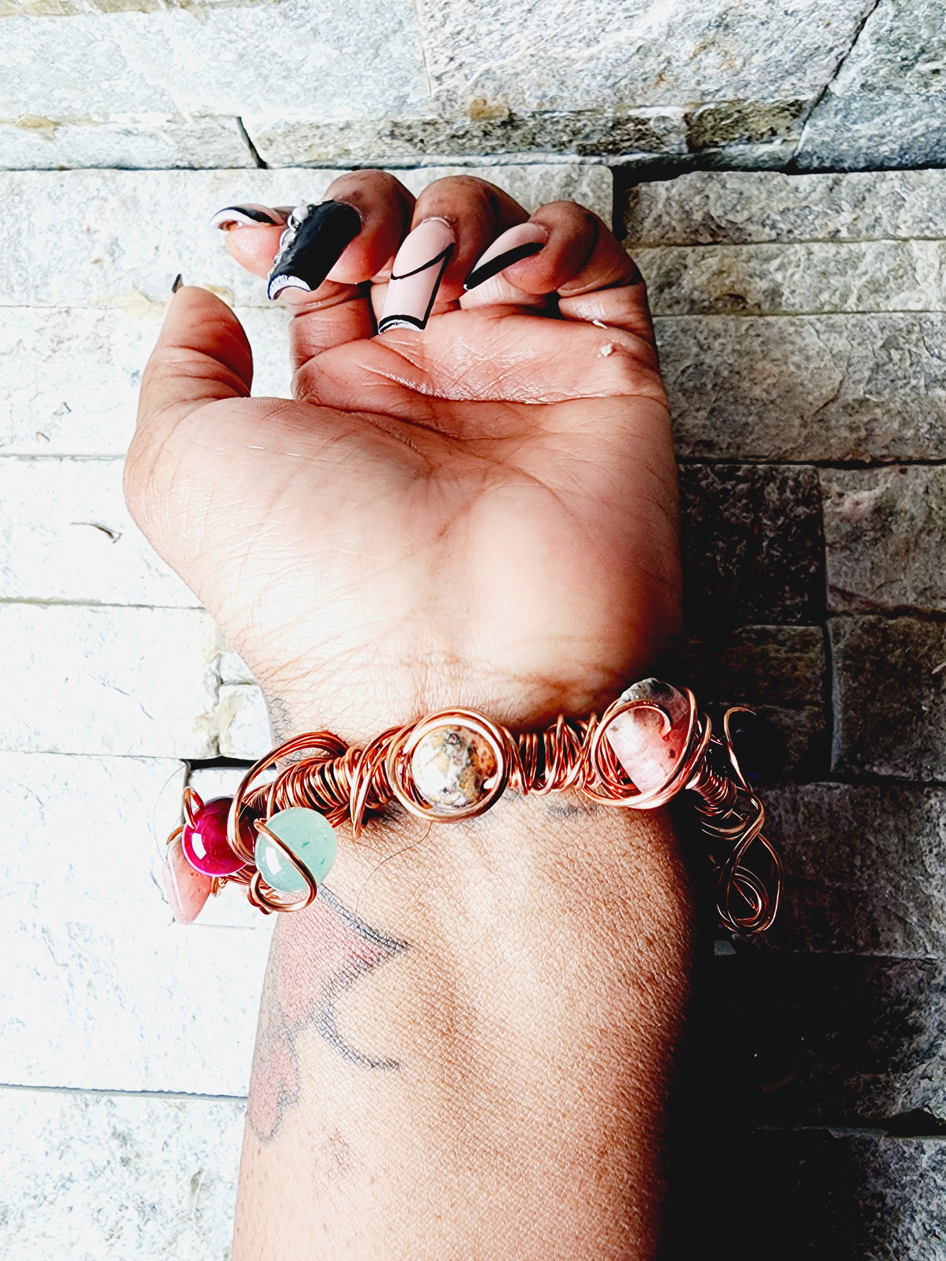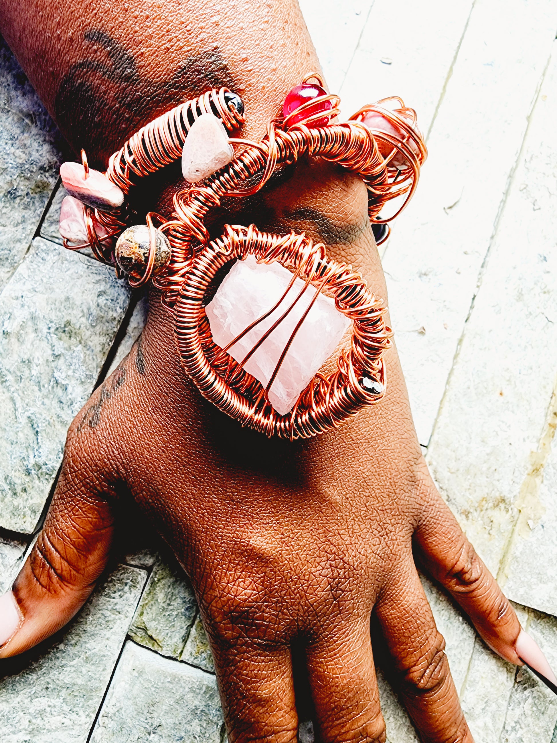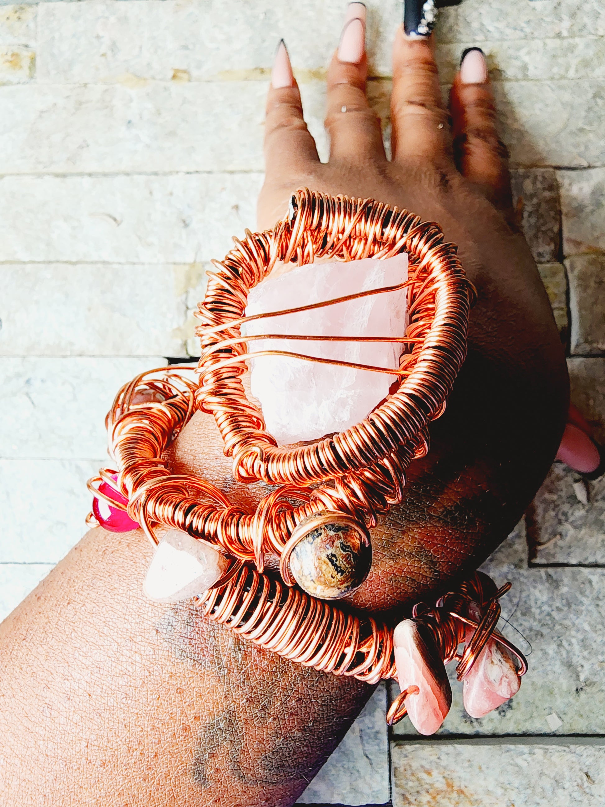 Handcrafted copper crystal jewelry set — wire-wrapped rings and bracelets designed for spiritual alignment, style, and energy elevation.