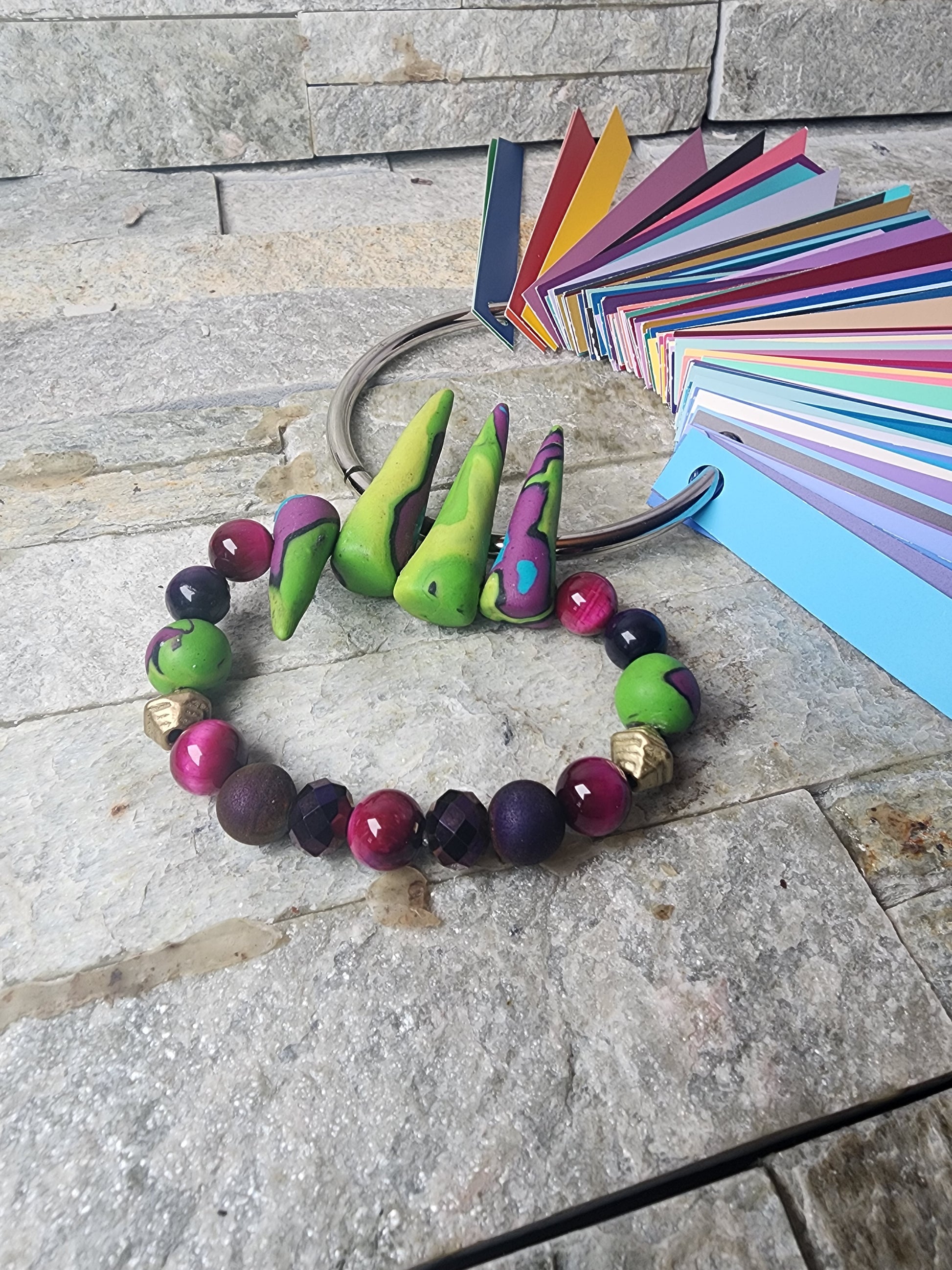 Our unorthodoxed polymer clay bracelets mixed with gemstone crystals are a sensory experience – a touch of earth, a hint of the cosmos, and a dash of unmatched artistry.